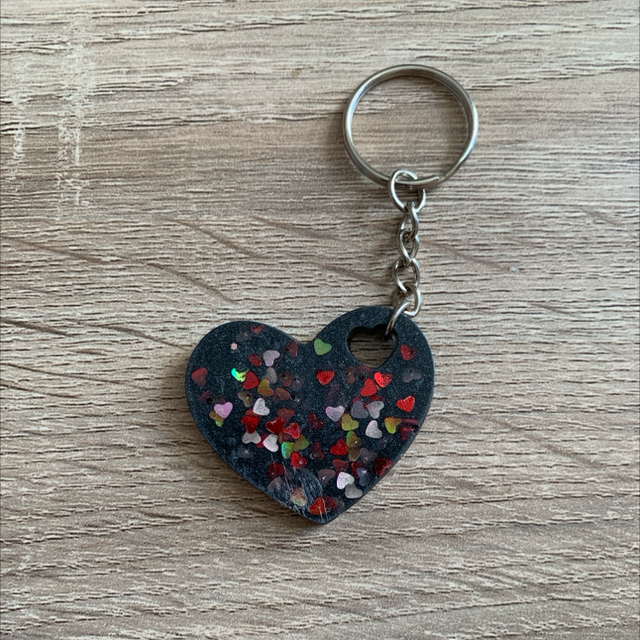 Charmant porte-clés en résine en forme de cœur. Chaque pièce est unique et constitue un petit cadeau idéal